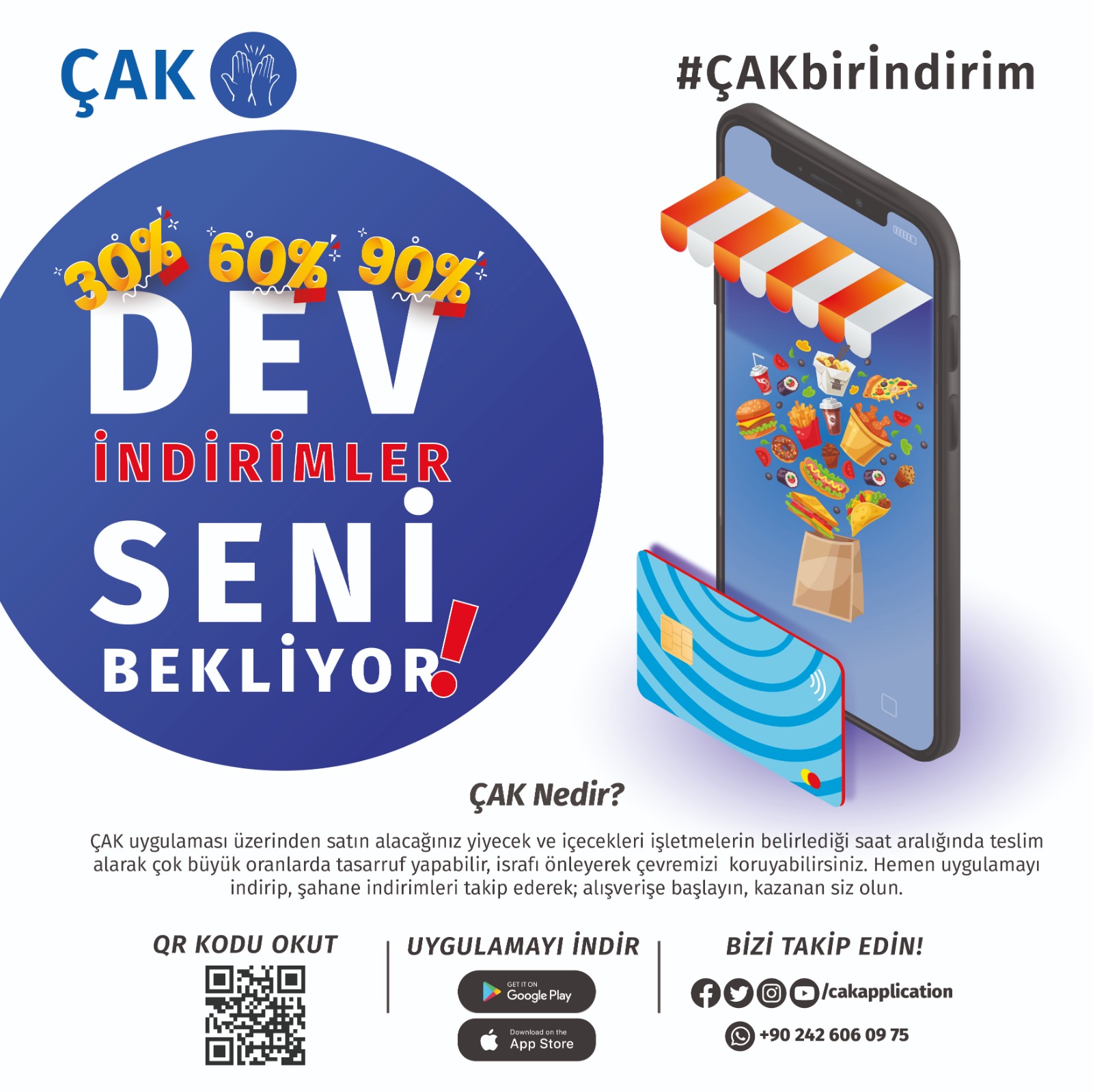Alanya merkezli kurulan ve Alanya Alaaddin Keykubat Üniversitesi Bilgisayar Mühendisliği öğretim elemanı ve öğrencileri tarafından geliştirilerek faaliyetlerini sürdüren mobil uygulama ÇAK, işletmelerin ve müşterilerin yeni gözdesi oldu. Yiyecek, içecek ve gıda sektörüne yeni bir soluk getiren mobil uygulama ÇAK, Alanya’da yaşayan herkesi bu uygulamayı kullanmaya davet ediyor. Mobil uygulama ÇAK sayesinde kullanıcılar, işletmelerin promosyon kampanyalarını ve gün içinde tüketilmesi gereken ürünlerini uygulama üzerinden takip ederek her gün yüzde 30 ile yüzde 70 aralığında net indirim fırsatı sunuyor. Her güne özel belirlenen indirimlerden yararlanmak isteyenlerin tek yapması gereken ise “Google Play ve App Store”dan ÇAK uygulamasını indirerek kayıt olmak.